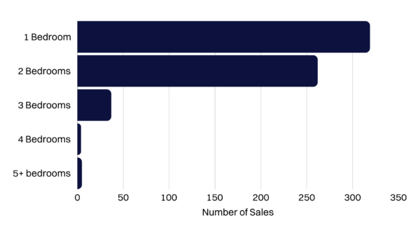 Because of this, compact properties such as one and two bedroom apartments make up a large portion of transactions in the area.